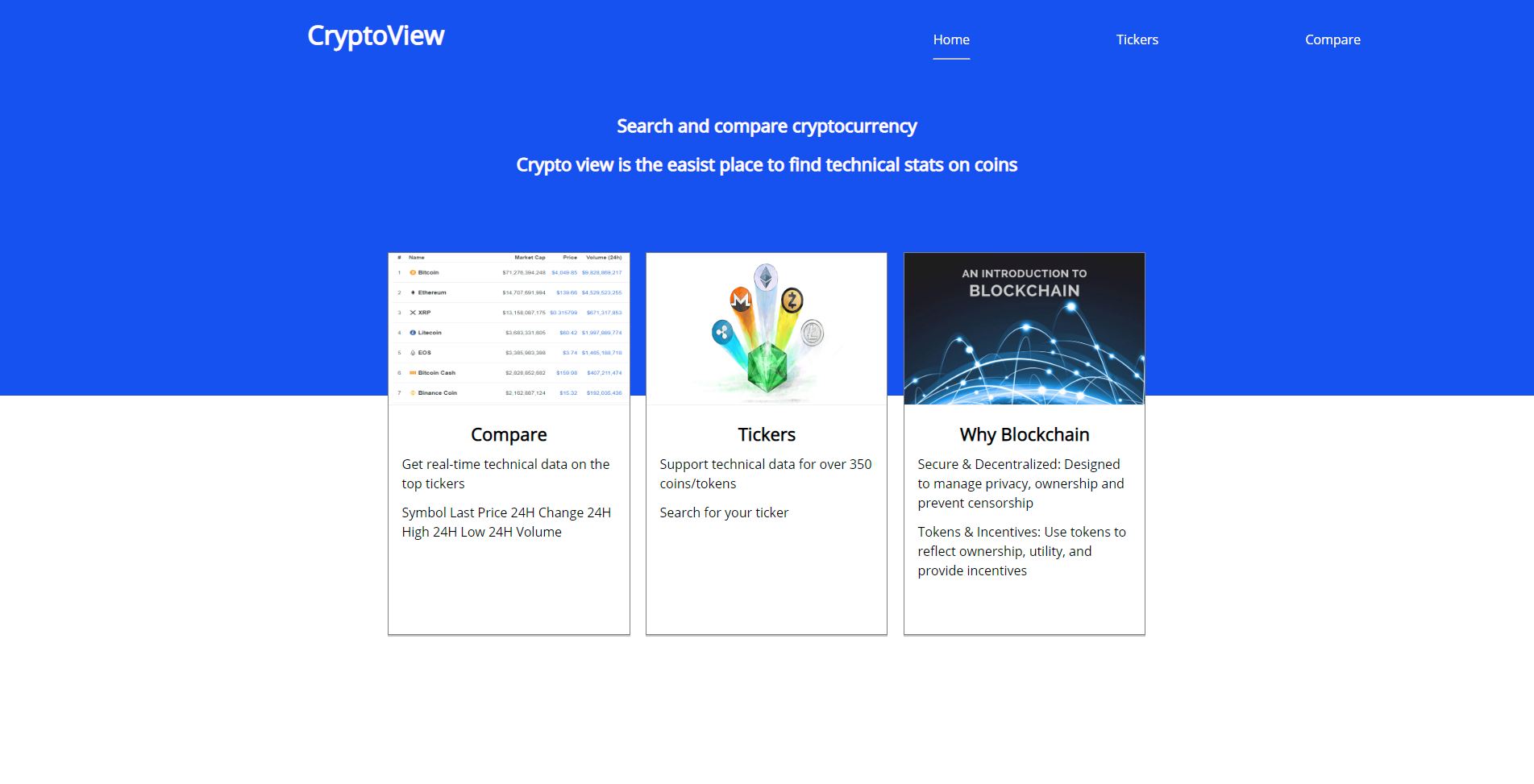 Allows users to search two cryptocurrencies and get back real-time data and news, specifically price volume price change and low/high of day essential technical prices. The news are articles from sources like CNN and users can see the source of the article and if they want to can click on the title to open a new window that will take them to that article or story.very simple app that returns real-time reliable technical data on a very big topic in today's society, Cryptocurrency .